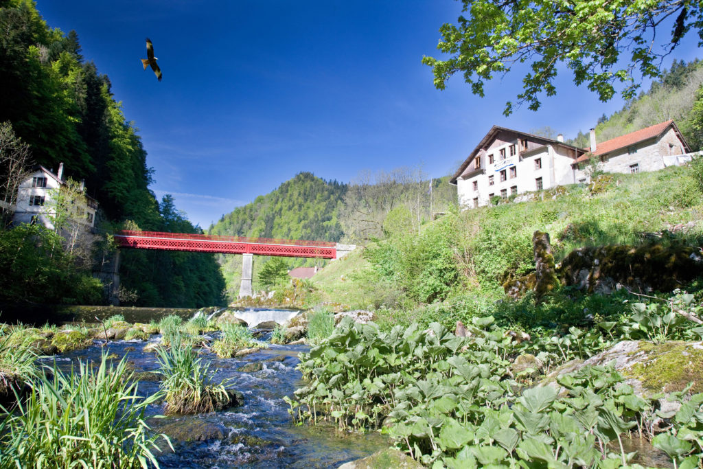 De retour Aux Bois, vous continuez en direction de la Ferrière pour redescendre sur Maison Monsieur où la traversée du Doubs s’effectuait auparavant en barque après avoir sonné le passeur. Avant d’y arriver faites une halte près du lac du « Cul des Prés » qui a la particularité de stocker l’eau et de la restituer peu à peu, puis au point de vue de la « Roche Guillaume » « Maison Monsieur » au bord du Doubs, est un écrin de verdure idyllique qui semble hors du temps.