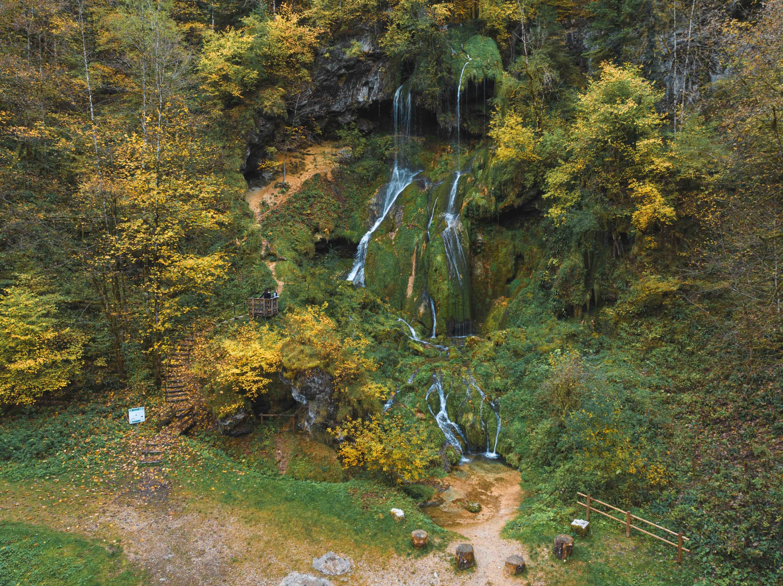 Le ruisseau dégringole la falaise sur une hauteur de 25 mètres en créant de beaux massifs de tuf.